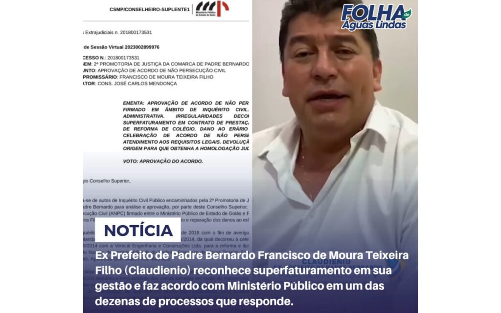 O ex-prefeito de Padre Bernardo, Francisco de Moura Teixeira Filho, firmou um acordo de não persecução civil no âmbito do inquérito civil IC n° 2018000173351 da 2ª Promotoria de Justiça de Padre Bernardo.