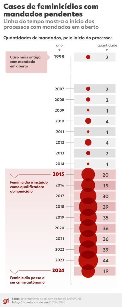 O levantamento do g1 tem como base o Banco Nacional de Medidas Penais e Mandados de Prisão (BNMP), do Conselho Nacional de Justiça (CNJ), e mapeou crimes cometidos ao longo de mais de duas décadas, entre o fim dos anos 1990 e 2023. Há casos de feminicídio e de tentativa de feminicídio.