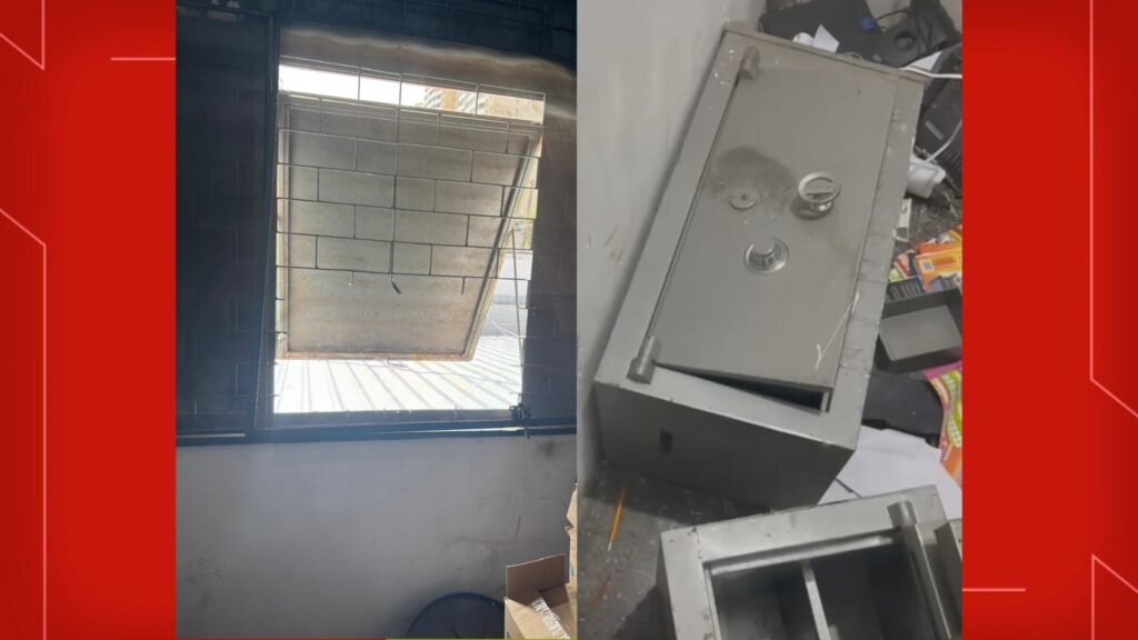 Imagens do local mostram a janela e uma porta danificadas, dois cofres abertos a força e itens da lotérica espalhados pelo chão (veja vídeo acima).