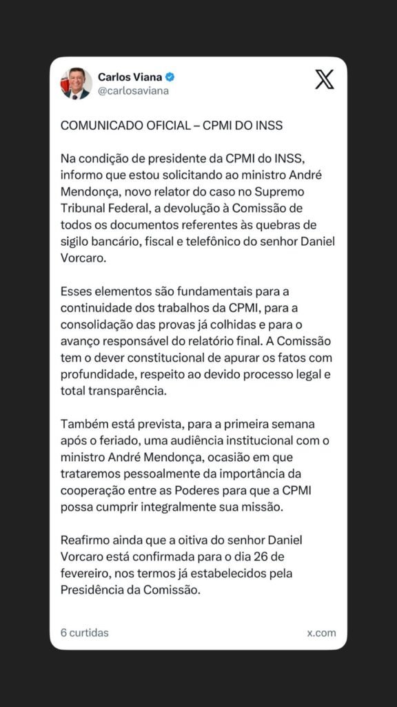 O presidente da CPMI do INSS, Carlos Viana (Podemos-MG), encaminhou nesta sexta-feira (13) um pedido ao novo relator do inquérito do Master, ministro do Supremo Tribunal Federal (STF) André Mendonça, para que sejam devolvidos para a comissão todos os documentos sigilosos referentes ao Banco Master e a seu dono, Daniel Vorcaro.