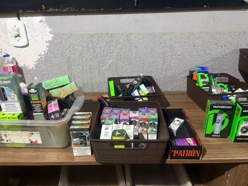 Dentro do comércio, foram apreendidos cerca de 200 itens, entre vapes, pods descartáveis, essências com nicotina e acessórios. Dois celulares e cadernos com anotações do comércio também foram recolhidos.