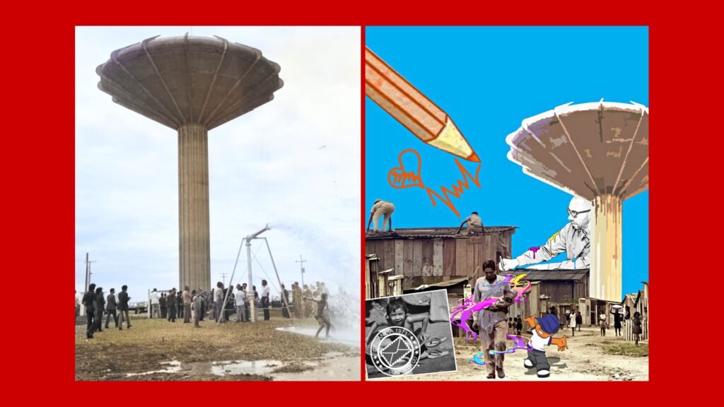 À esquerda foto original da caixa d’água da Ceilândia e à direita obra do artista Elom