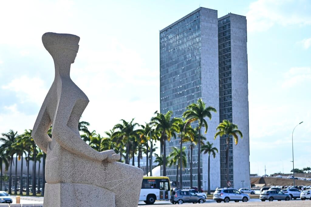 A estátua ‘A Justiça’, em frente ao prédio do STF e ao fundo Prédio do Congresso Nacional.