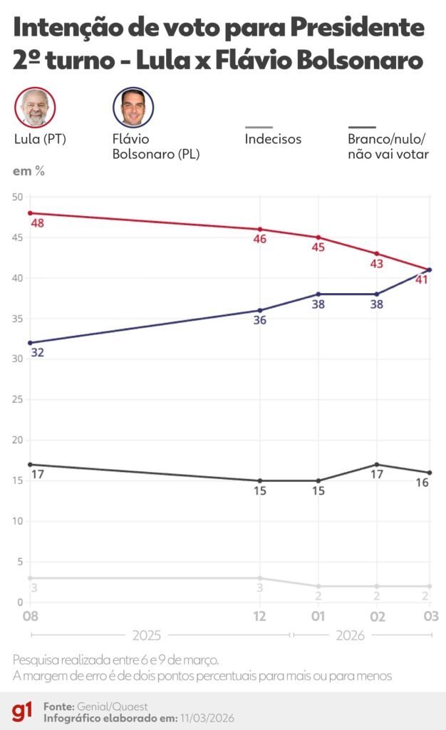 A pesquisa de março mostrou pela primeira vez um empate entre Lula e Flávio Bolsonaro no segundo turno, ambos com 41% das intenções de voto.