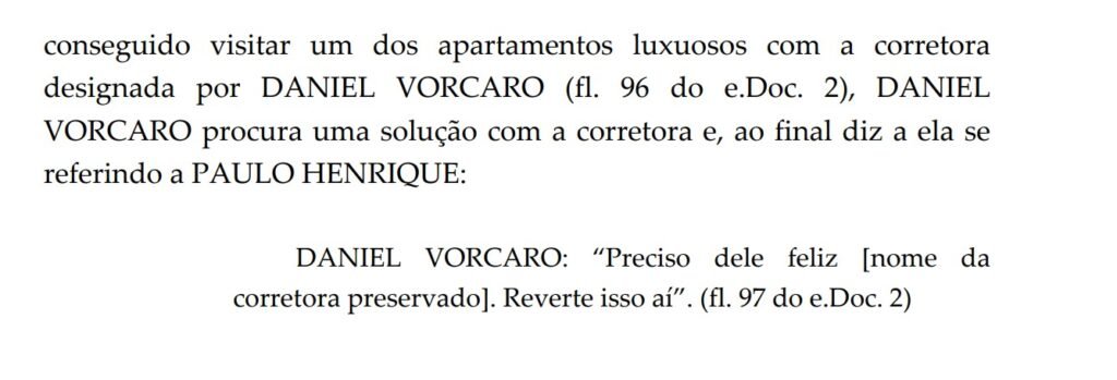 Em uma das conversas, ao tratar de um imóvel, Vorcaro afirma a uma corretora: “Preciso dele feliz. Reverte isso aí”. Vorcaro procurou a profissional após o ex-diretor do BRB dizer que ficou decepcionado por não conseguir visitar um dos apartamentos que fazia parte do acordo entre eles.