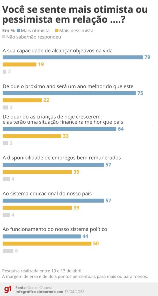 Pesquisa Quaest aponta que 79% dos brasileiros disseram estar otimistas em alcançar seus objetivos. Contudo, 50% afirmaram que se sentem pessimistas com o funcionamento do sistema político do país.