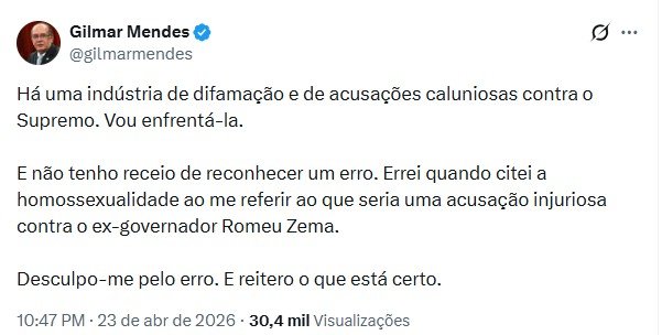 Gilmar Mendes se desculpa por fala em entrevista.